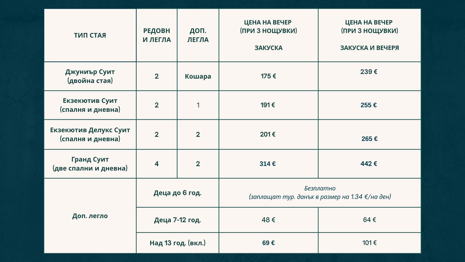 Всички посочени цени са в евро (при настаняване на редовни легла) и включват още: